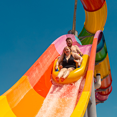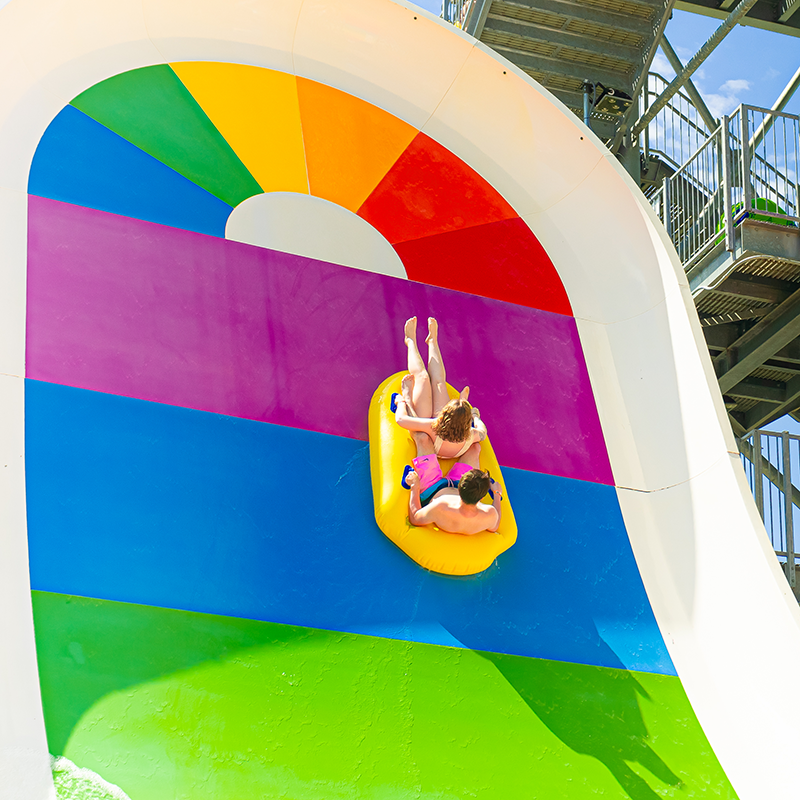 Experience the zero gravity sensation of weightlessness as you plummet over 47’ down the half pipe and get vertical! This will leave you breathless! This slide is built for double tubes for two riders at a time.