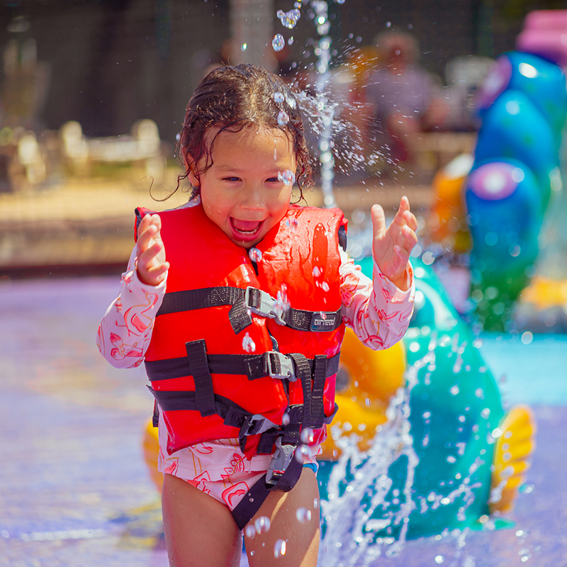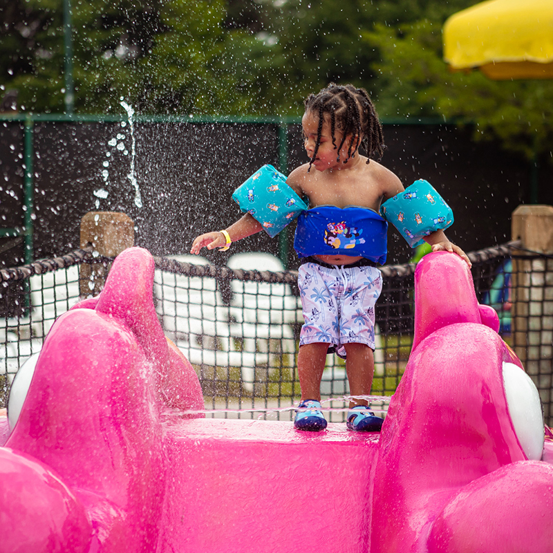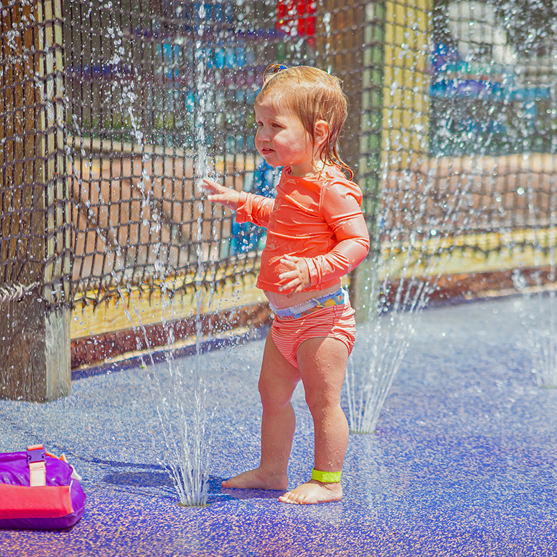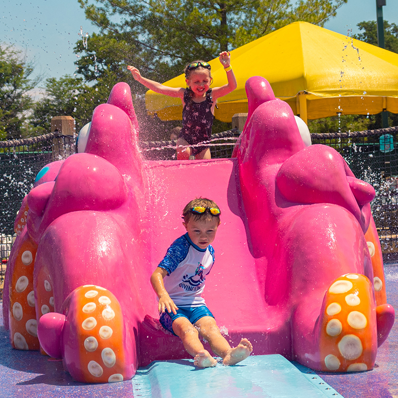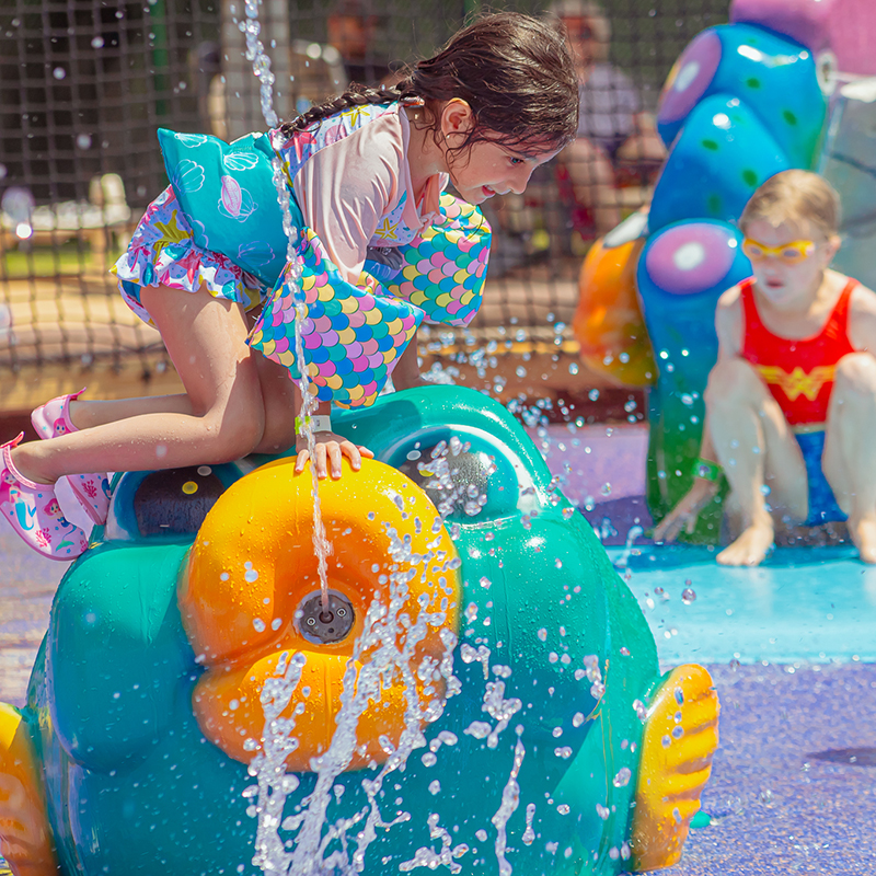 This exciting splash pad and activity pool has spray jets and fun for the whole family including new slides and bubblers! Test your agility or race a friend on the floating crosswalk. Venture to the far end of the pool to play some water hoops!